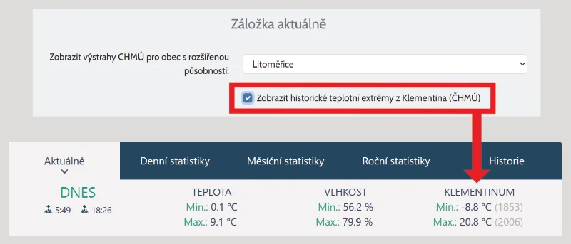 On the "Currently" tab, you can now display historical temperature extremes from Prague's Klementinum observatory (source: ČHMÚ , data since 1775). For each day of the year, you will see the historical minimum and maximum, so you can compare current weather with long-term records. You can enable this feature in the sensor settings on the "Web display" tab.